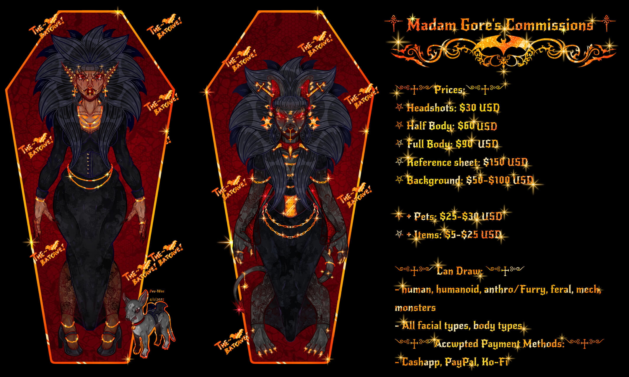 Welcome too: Madam Gore's/The Batcave's Commissions! Be sure to read the T.O.S upon purchasing an order. Click on the buttons above to view: Examples along with the Prices, Payment Methods, The Queue, the Terms of Service, Written Reviews/Finished commissions, and Madam's socials.0/5 slots availble